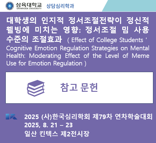 최우경, 김진숙. (2012). 대학생의 생활스트레스와 자살생각과의 관계: 인지적 정서조절의 조절효과와 매개효과. 상담학연구, 13(1), 255-272.