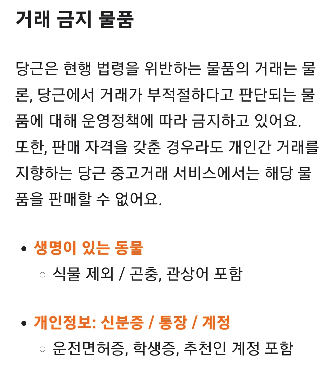 여기서 잠깐 당근 거래 금지물품에 대하여 자세히 보기를 해보았습니다. 핵심은 당근 궁고거래 서비스에서는 현행법령을 위반하거나, 거래에 부적절하다고 판단되는 물품은 판매할 수 없다고 규정하고 있습니다.