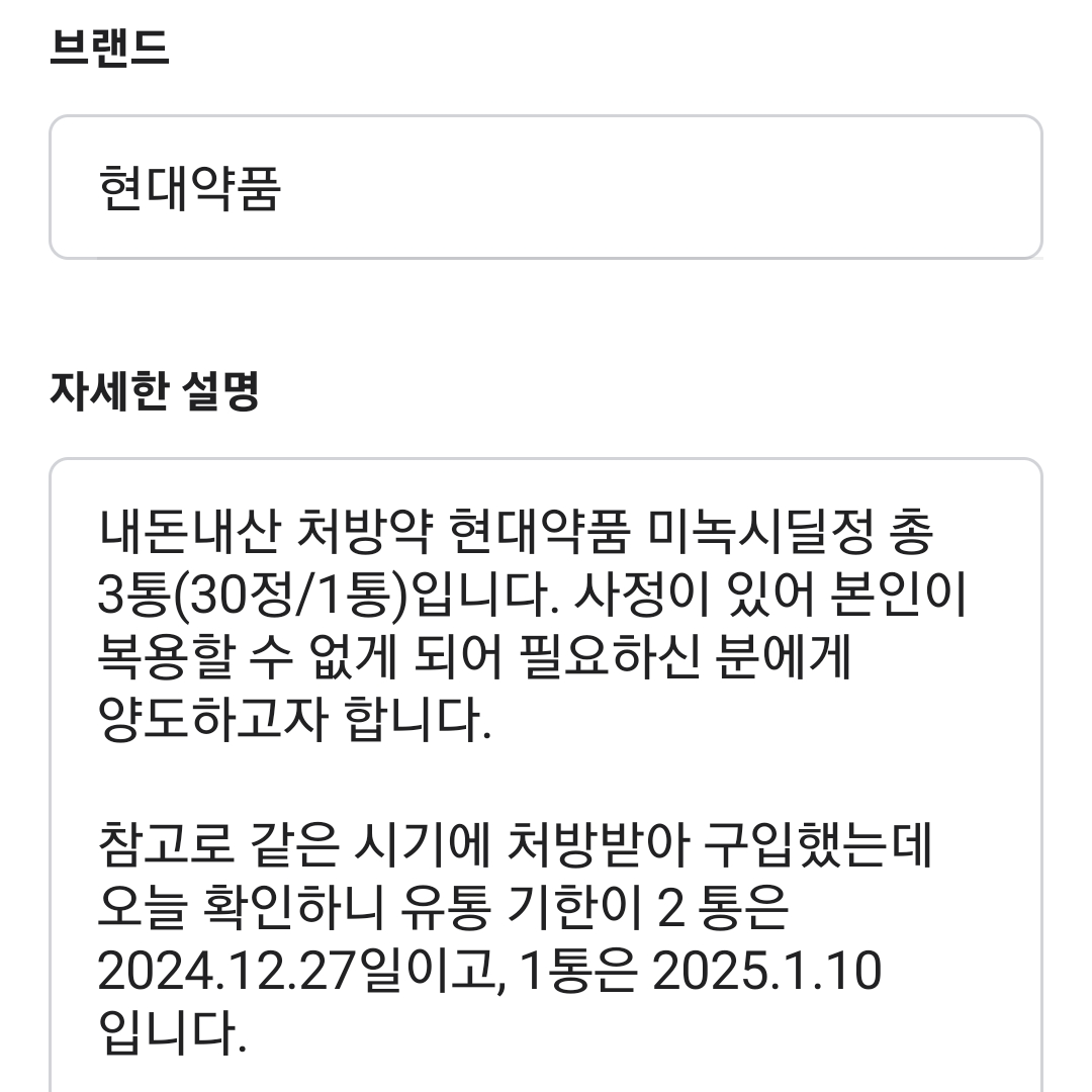 "내돈내산 처방약 현대약품 미녹시딜정 총 3통(30정/1통)입니다. 사정이 있어 본인이 복용할 수 없게 되어 필요하신 분에게 양도하고자 합니다."