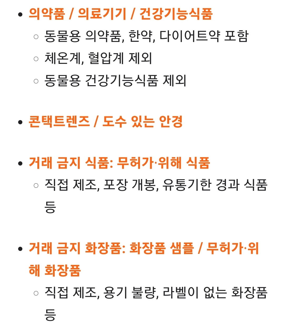 또한 동물용 의약품, 한약, 다이어트약, 체온계, 혈압계, 동물용 건강기능식품, 콘택트렌즈, 도수있는 안경, 직접 제조, 포장 개봉, 유통기한 경과한 식품도 거래금지하고 있습니다. 화장품 샘플, 무허가 위해 화장품도 거래금지하고 있습니다.