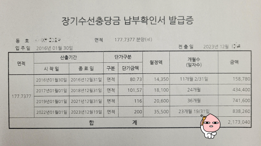 위의 장기수선충당금 납부 확인증은 집주인인 제가 경기도 성남시에 있는 공동주택에 이사를 가게되면서 세입자에게 지불해야할 금액의 합계입니다. 38~39평대 아파트인데 세입자가 8년간 거주하는 동안 납부한 장기수선충당금 금액이 217만원을 넘습니다.