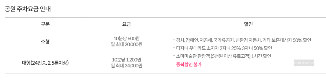 올림픽공원 내에는 대략 여섯 곳의 주차공간이 있으며 가장 주차가능 차량대수가 많은 주차장은 K-아트홀(태권도 공연장)로 562대이며, 그다음은 올림픽홀로 365대입니다. 주차요금은 위의 표와 같이 소형 승용차 기준으로 일 최대 20000원이며, 10분당 600원을 부과하고 있습니다.